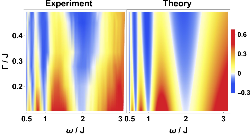 该课题组利用镱离子能级,巧妙地实现了量子态的耗散,并将其与微波耦合一起构成实现哈密顿量主要操控部分(图1)。作为该实验系统的囚禁离子体系是量子模拟、量子计算等主要研究平台之一,具有与环境耦合小、参数可控性高等量子性质,具备进行量子态层析投影测量的能力,不仅可以测量以往实验中展现的态占据数演化,也可以展现体系密度矩阵相干项的演化,从而完整展示演化的量子过程(图2)。由此出发,课题组发现了两组和实验参数无关的初态和测量态,可以直接由体系演化测量结果得到体系的能量值,而体系能量值为0的点正是对应的该体系奇异点。在此基础上,课题组引入周期性驱动和耗散,将原本定态哈密顿量扩展为含时哈密顿量,并由相似的方案测量得到系统能量,首次由实验绘制了体系的相图,并观测到系统哈密顿量周期与量子态耦合强度在一定条件下发生的多光子共振现象(图3),最后在附录部分从理论上分析了含时体系在测量周期微扰中的优势。