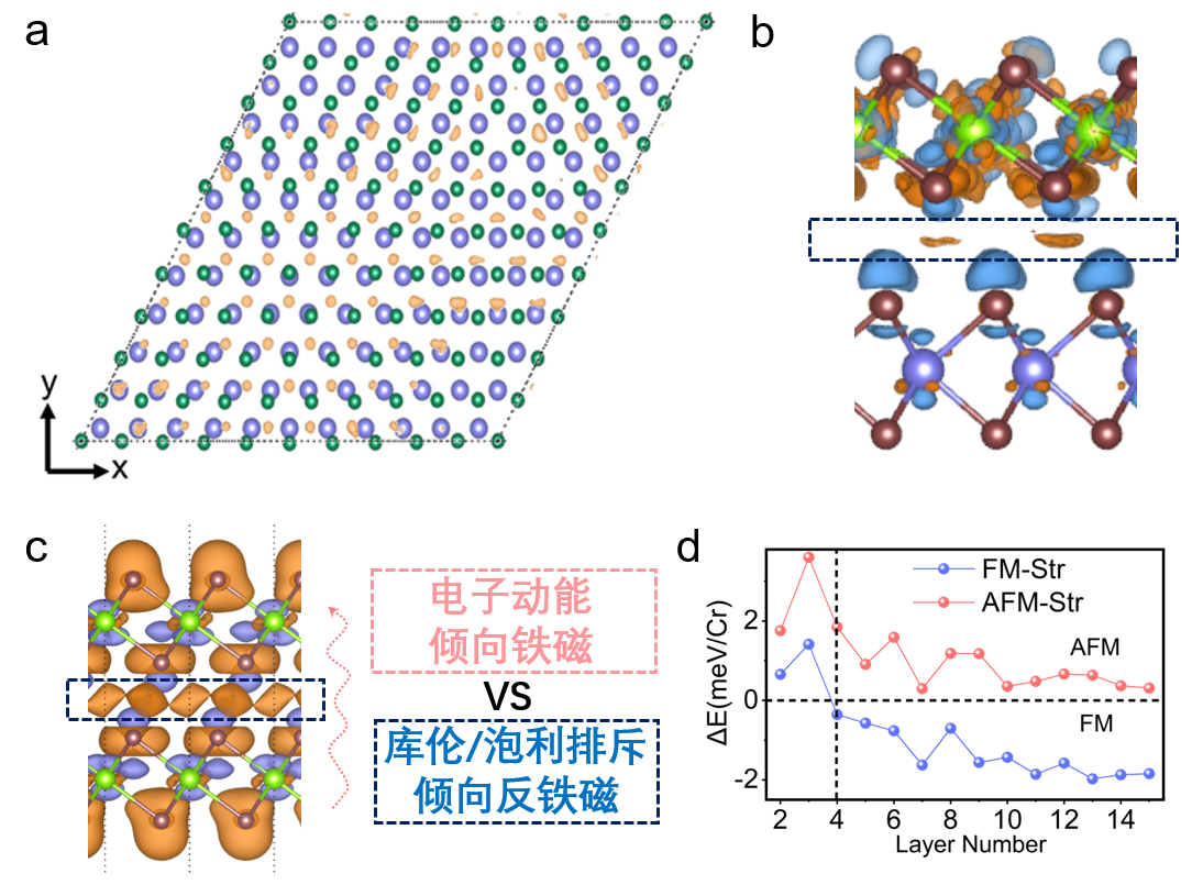 10.1103/PhysRevB.102.020402)。而这一规律恰好可以解释此次实验观测到的层数依赖磁性变化现象,即随着层厚增加,电子沿着CrSe2层间方向运动的动能增加,逐渐压制了因泡利和库伦排斥导致的层间反铁磁耦合,转变至层间铁磁耦合,使得宏观铁磁性逐渐占据上风(图2d)。