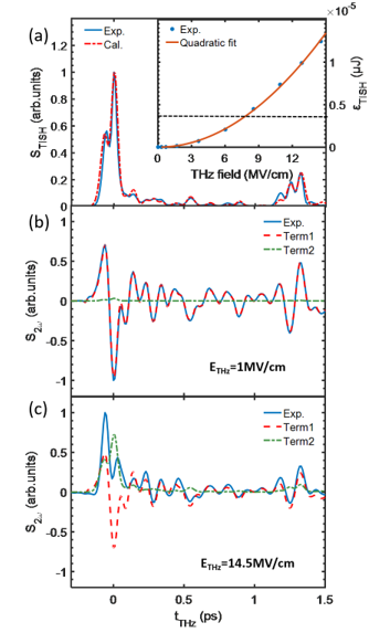 图2. 来自水膜的TISH能量信号和相干信号。(a) 在没有施加CSH探测时的测量(蓝色实线)和计算(红色虚线)的TISH能量信号。插图显示了TISH能量作为太赫兹场强的函数,其中二次拟合由红色实线表示。插图中的黑色虚线标记了图2(b)和图2(c)实验中使用的CSH能量。(b)、(c) 太赫兹场强分别取1 MV/cm和14.5 MV/cm时的TISH和CSH相干信号。蓝色实线为测量结果,红色虚线和绿色虚线分别对应式(2)中第一项(相干分量)和第二项(非相干分量)的计算结果。