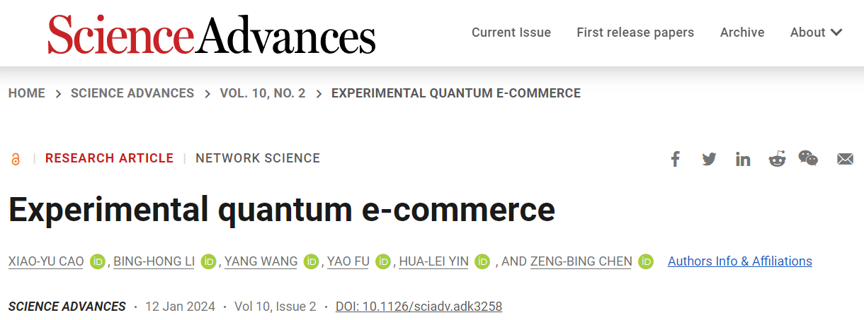 近期,太阳成集团tyc官网物理学系、量子态构筑与测控教育部重点实验室尹华磊副教授课题组与太阳成集团tyc、固体微结构物理国家重点实验室、人工微结构科学与技术协同创新中心的陈增兵教授组成的团队基于一次性全域哈希量子数字签名理论提出了首个量子电子商务方案,在国际上首次实现了五用户的量子电子商务应用场景演示,为完整的电子商务交易流程提供了无条件的安全性保证。相关研究成果以“Experimental quantum e-commerce”为题于2024年1月12日发表在Science Advances《科学·进展》上。相关工作一经发表受到了国内外媒体的广泛关注,并且被Nature杂志以研究亮点、New Scientist 《新科学家》科技新闻杂志、新华社、人民日报海外版和光明日报等新闻媒体报道。