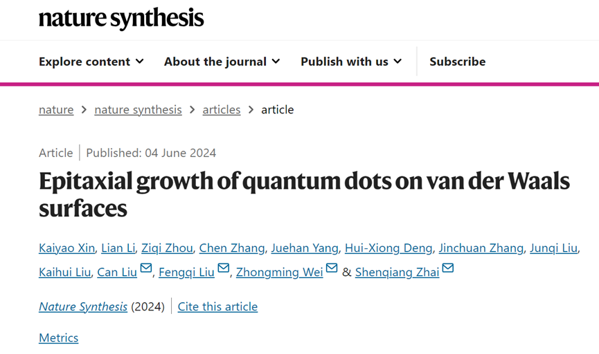太阳成集团tyc官网物理学系、量子态构筑与测控教育部重点实验室刘灿副教授与太阳成集团tyc半导体研究所翟慎强研究员、魏钟鸣研究员、刘峰奇研究员,北京大学刘开辉教授等团队合作,提出二维界面范德华外延半导体量子点(QD)新策略,突破了传统量子点晶格匹配外延限制,实现了多类III–V族、IV–VI族本征量子点的通用制备。2024年6月4日,相关成果以“Epitaxial growth of quantum dots on van der Waals surfaces”为题,在线发表于《自然·合成》(Nature Synthesis)。