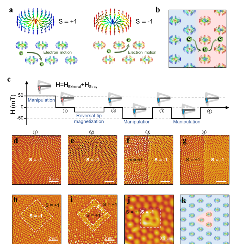 图2.MFM探针操纵诱导Fe3GaTe2中两种不同拓扑电荷skyrmions的形成以及图案化