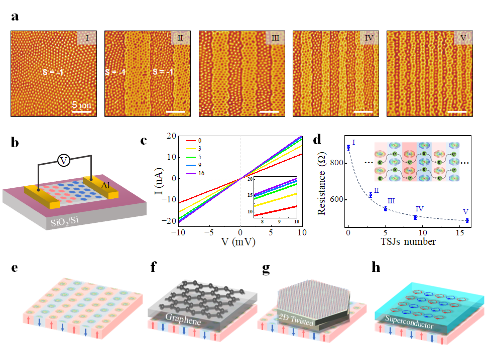 文章利用MFM技术,在Fe3GaTe2材料中成功实现了对skyrmions的精细操纵,并取得了较高的操控精度。研究者通过精细调控MFM探针尖端的杂散场,成功实现了skyrmion的可控形成与擦除的过程,并首创构建了具有相反拓扑电荷(S = ±1)的skyrmion共存态,即拓扑skyrmion结(TSJ)。这一技术有望为基于skyrmion的存储设备引入全新的二进制位表示方法,为自旋电子学领域的发展注入新的活力。进一步的研究表明,特殊的TSJ结构不仅提高了电子的传输效率,降低了器件电阻,而且还是作为二维异质结的组成材料,能够利用其周期性局域磁场和拓扑电荷的近邻效应来调控实现奇异超导量子态等。此外,TSJ随着磁场的变化揭示了具有不同拓扑电荷的skyrmions晶格会表现出截然不同的拓扑特性。