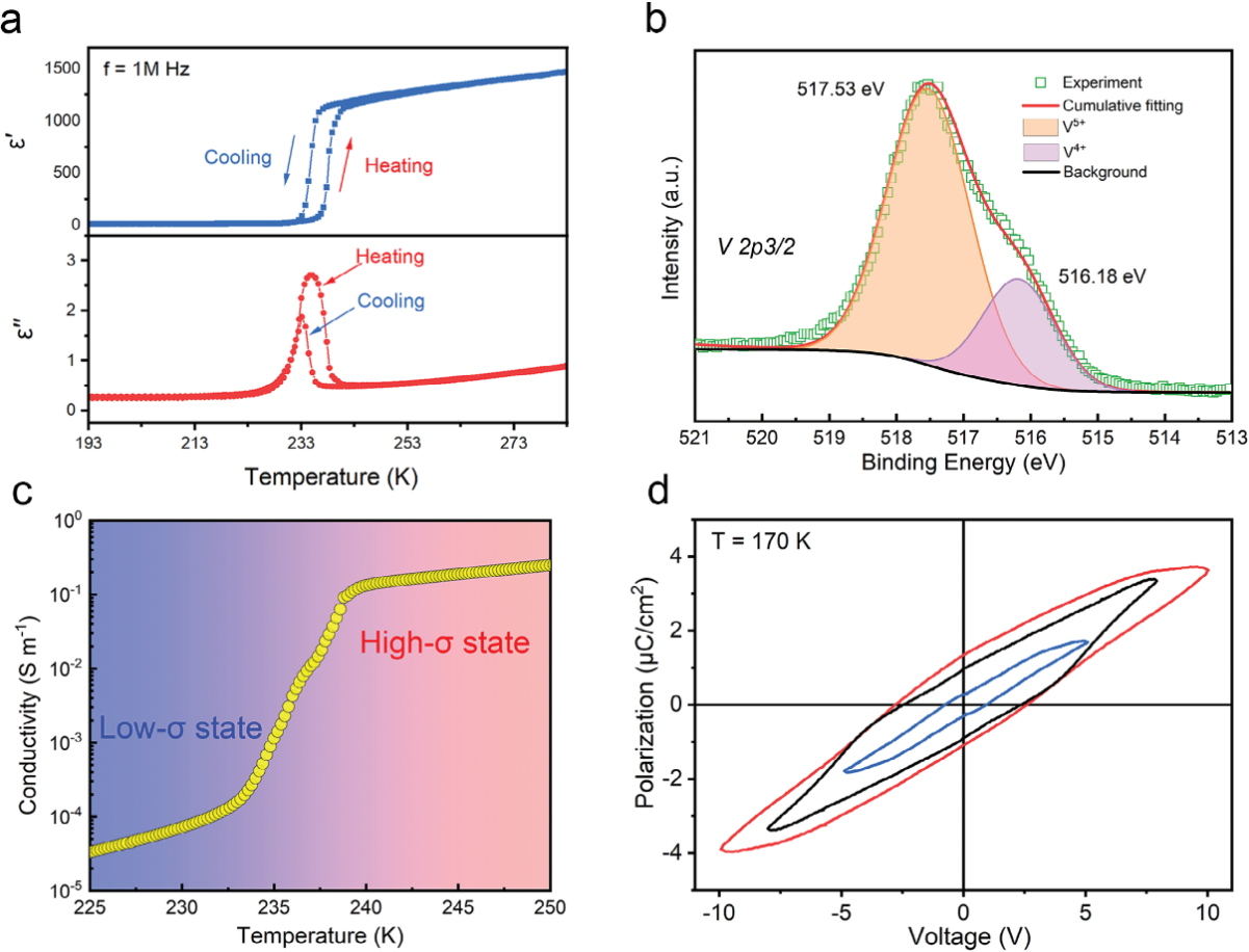 图2. (C7H14N)3V12O30的铁电性和电子性质。