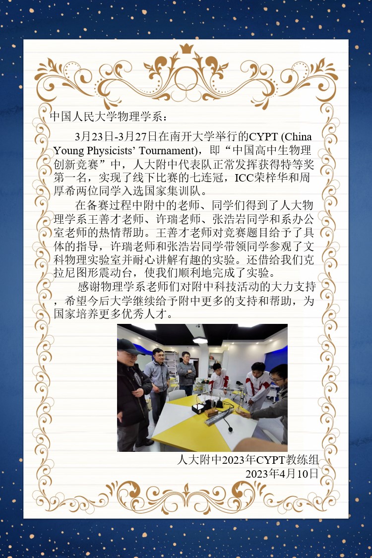 4曰10日,人大附中2023年CYPT教练组致信我系,感谢我系支持帮助人大附中代表队在“中国高中生物理创新竞赛”中取得特等奖第一名的好成绩。感谢信全文如下: